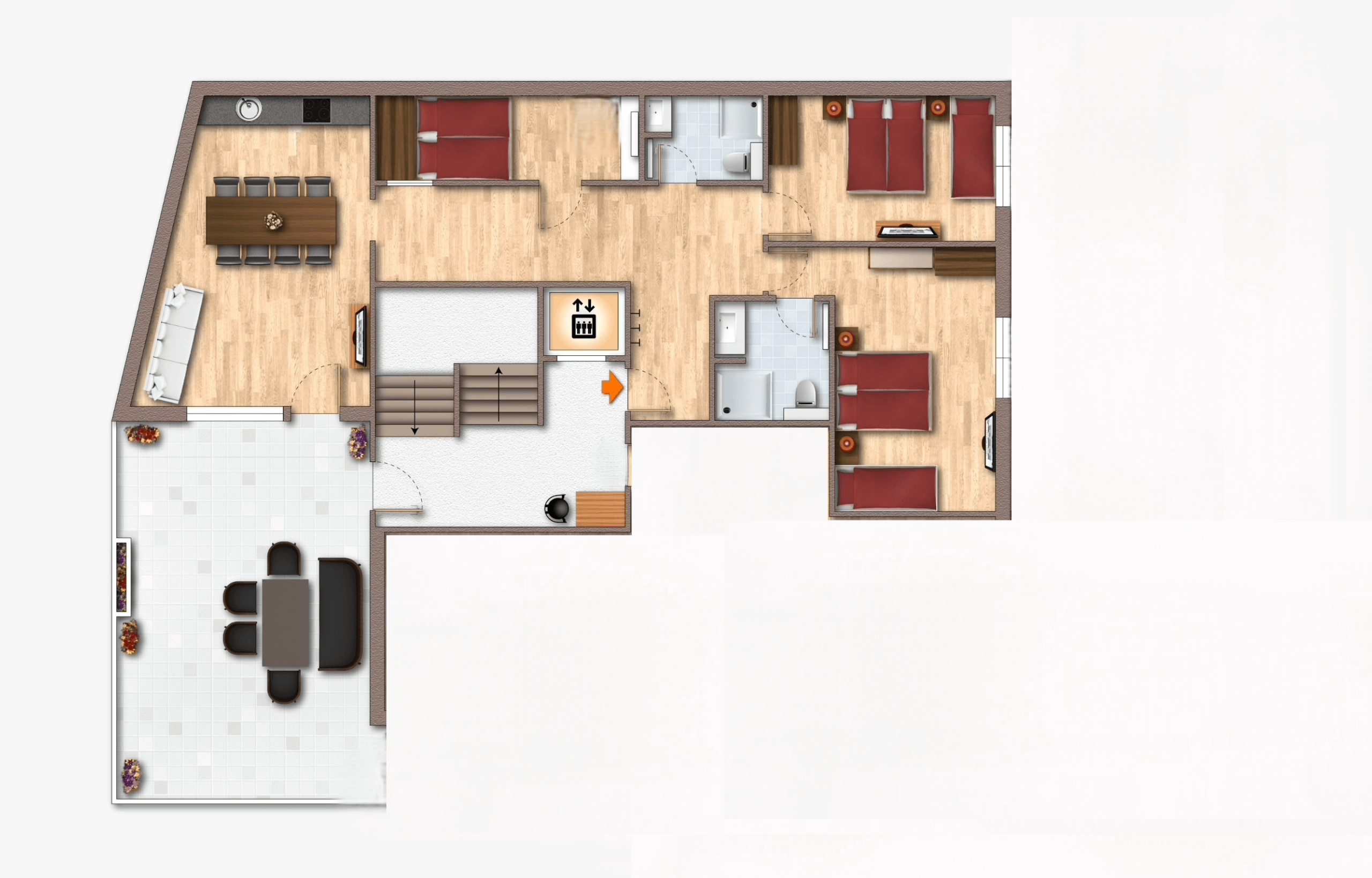 Das Apartment befindet sich im 1. Obergeschoss und bietet zwei Bäder, drei Schlafzimmer sowie eine geräumige Wohnküche. Die Wohunung ist auch mit dem Aufzug erreichbar.