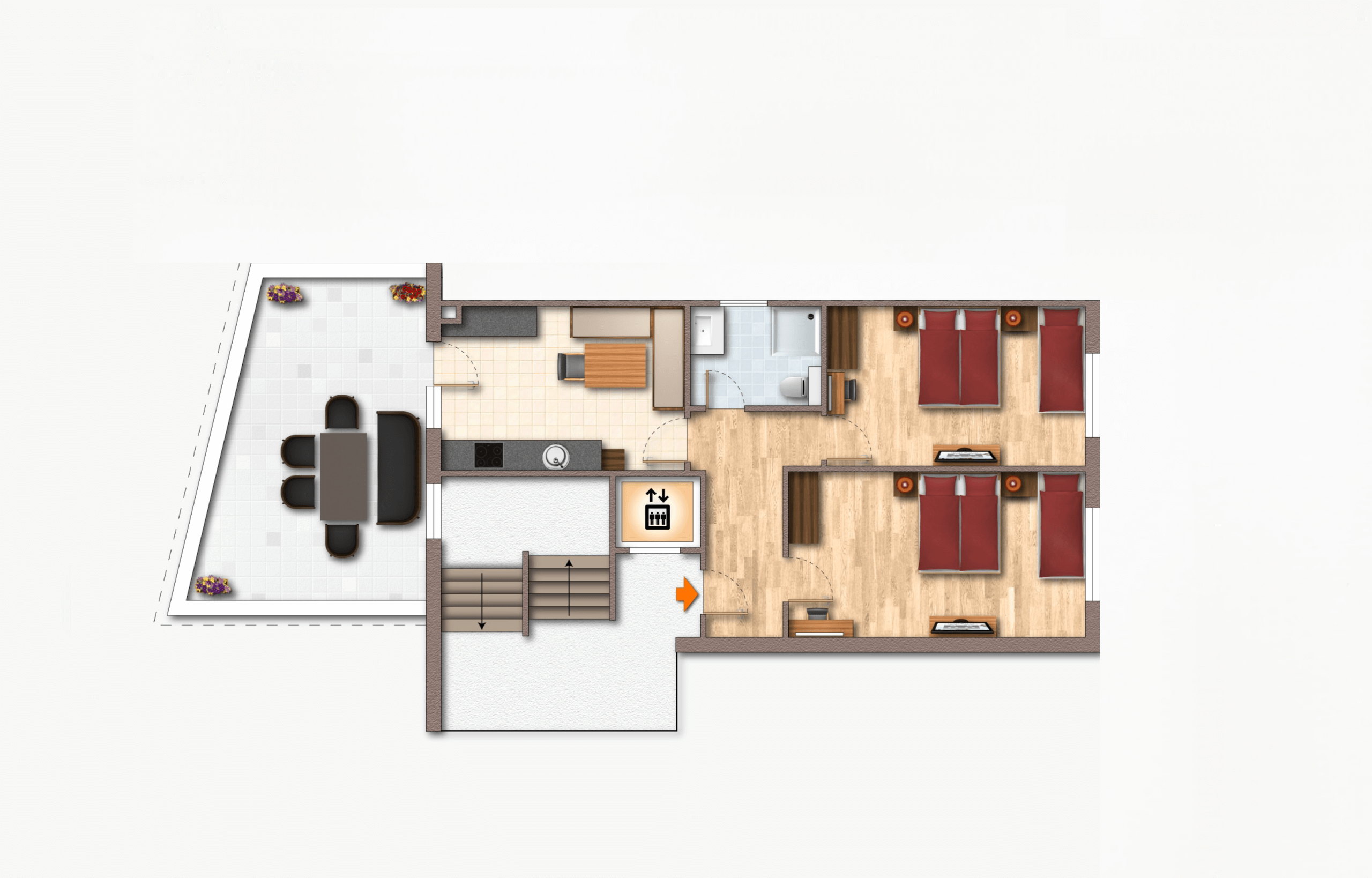 Das Apartment befindet sich im 2. Obergeschoss und ist über eine Treppe sowie einen Aufzug erreichbar. Es bietet ein Bad, zwei Schlafzimmer sowie eine geräumige Küche. Auf der Terasse lässt es sich Sommer wie Winter enspannen.