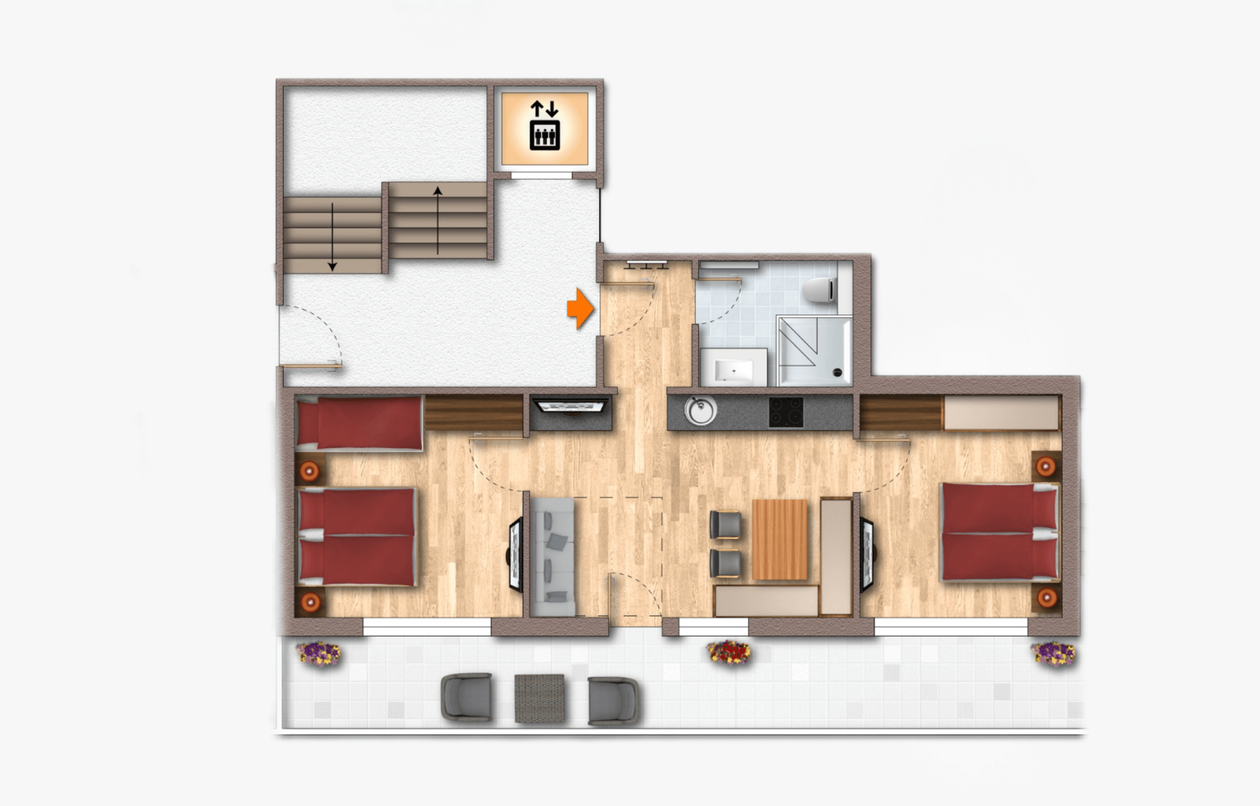 Das Apartment befindet sich im 1. Obergeschoss und bietet ein Bad, zwei Schlafzimmer sowie eine geräumige Wohnküche und einen Balkon. Die Wohunung ist auch mit dem Aufzug erreichbar.